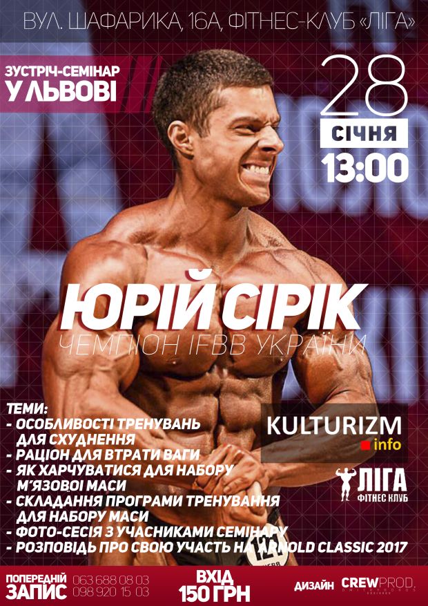 28 січня у Львові відбудеться зустріч-семінар з культуристом Юрієм Сіріком. Цей атлет виступає у федерації IFBB та має досвід на міжнародній сцені, зокрема, на престижному світовому турнірі Arnold Classic 2017.